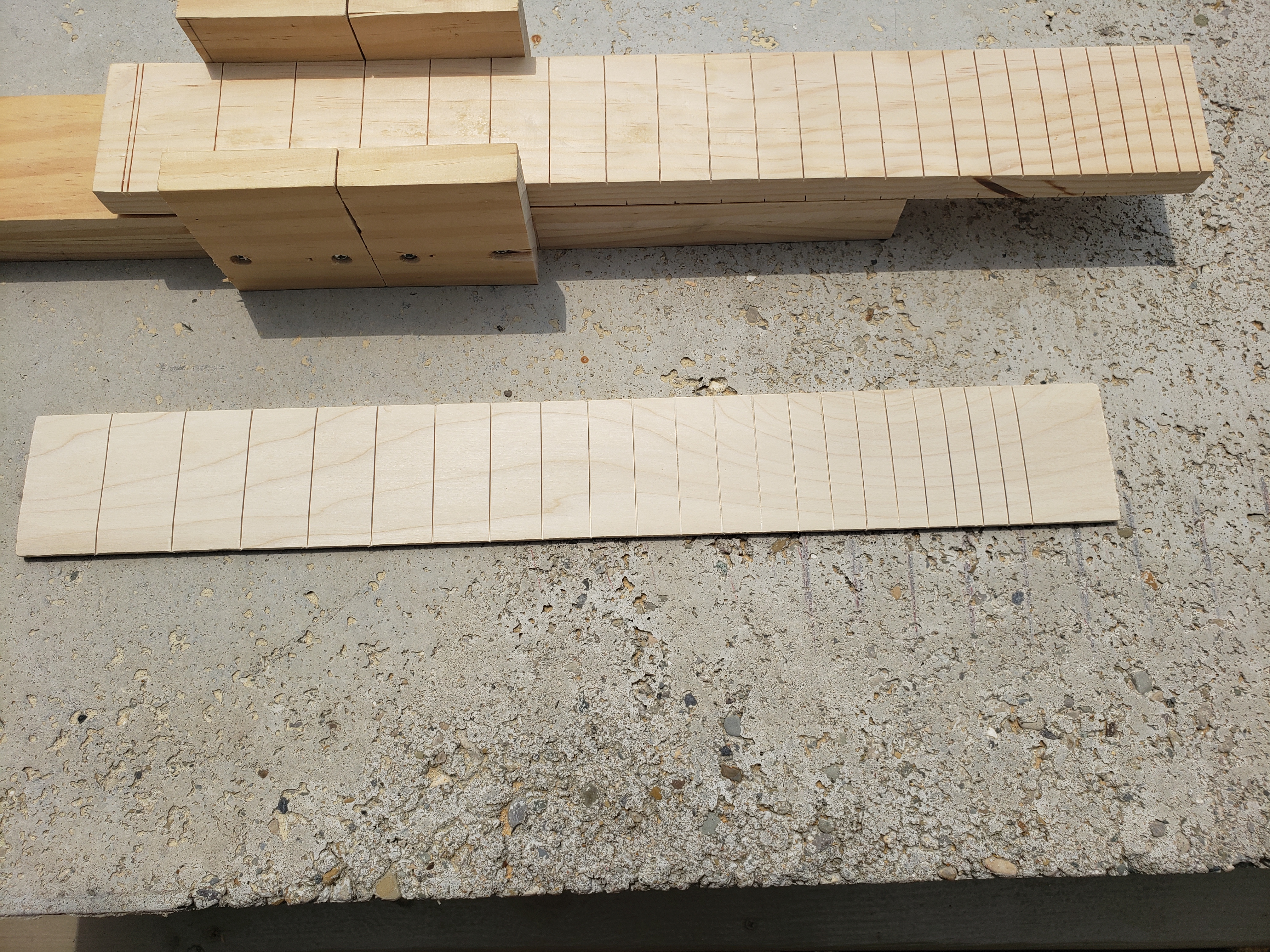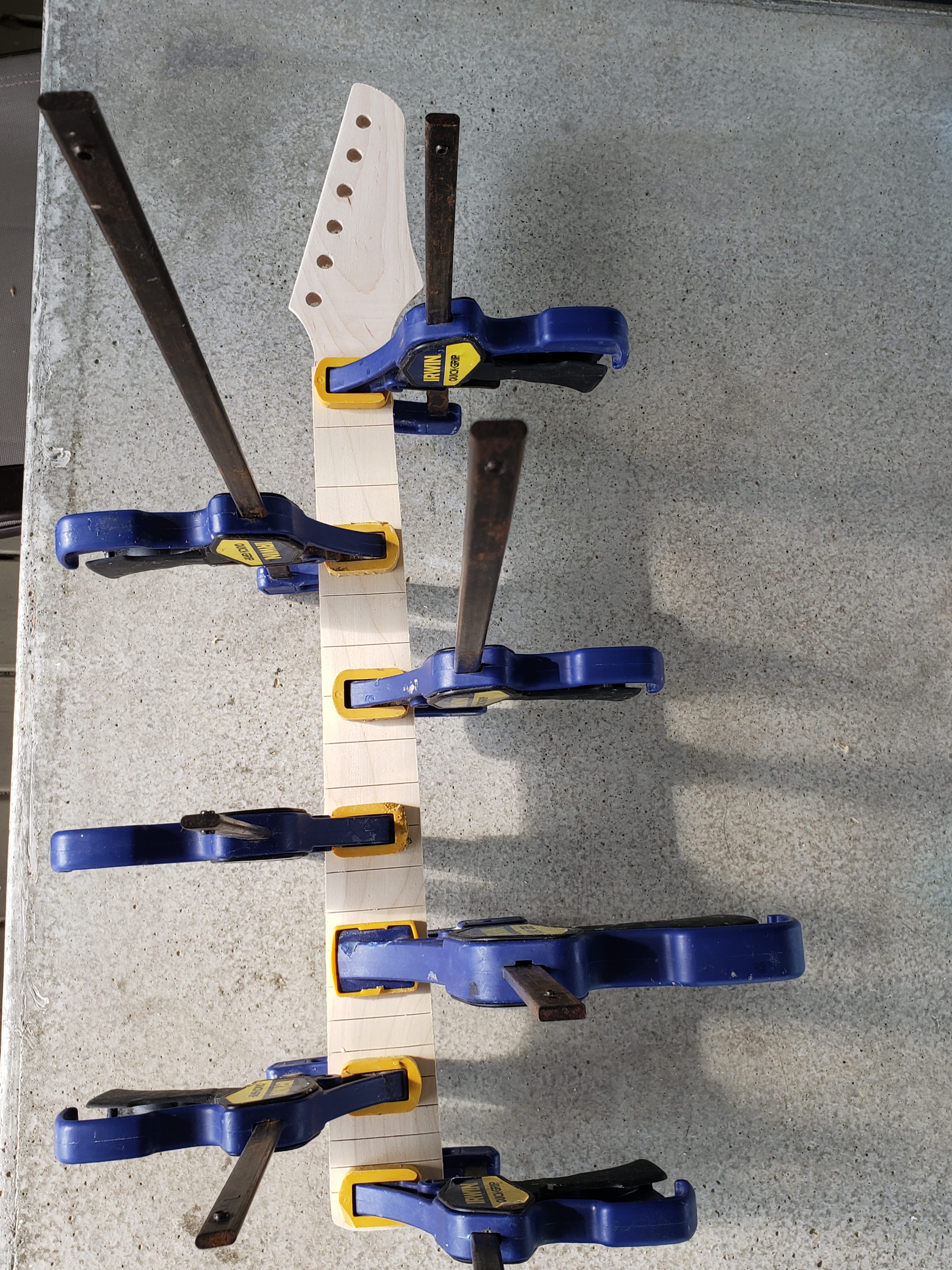 With the fretboard slotted, I used the same neck template to cut and rout the fretboard to match the neck, then glued the two pieces together, once again using way too many clamps.