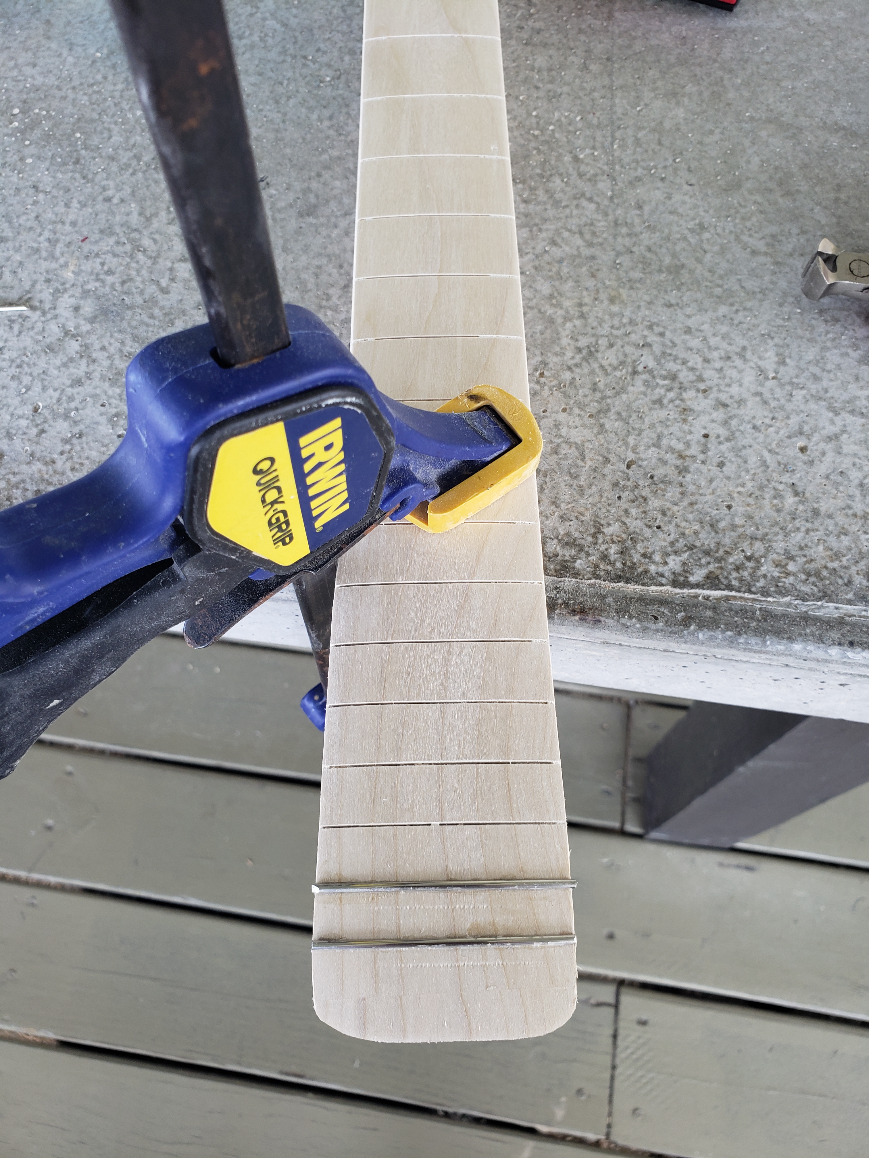 Unfortunately I don’t have one of the fancy (and expensive) fretpresses, so I decided to make my own using a $5 clamp from menards and 3D printing the other pieces I need. I tried just using a hammer to install a couple of the frets, and it worked fine, but I definitely felt like I had more control with the clamp.