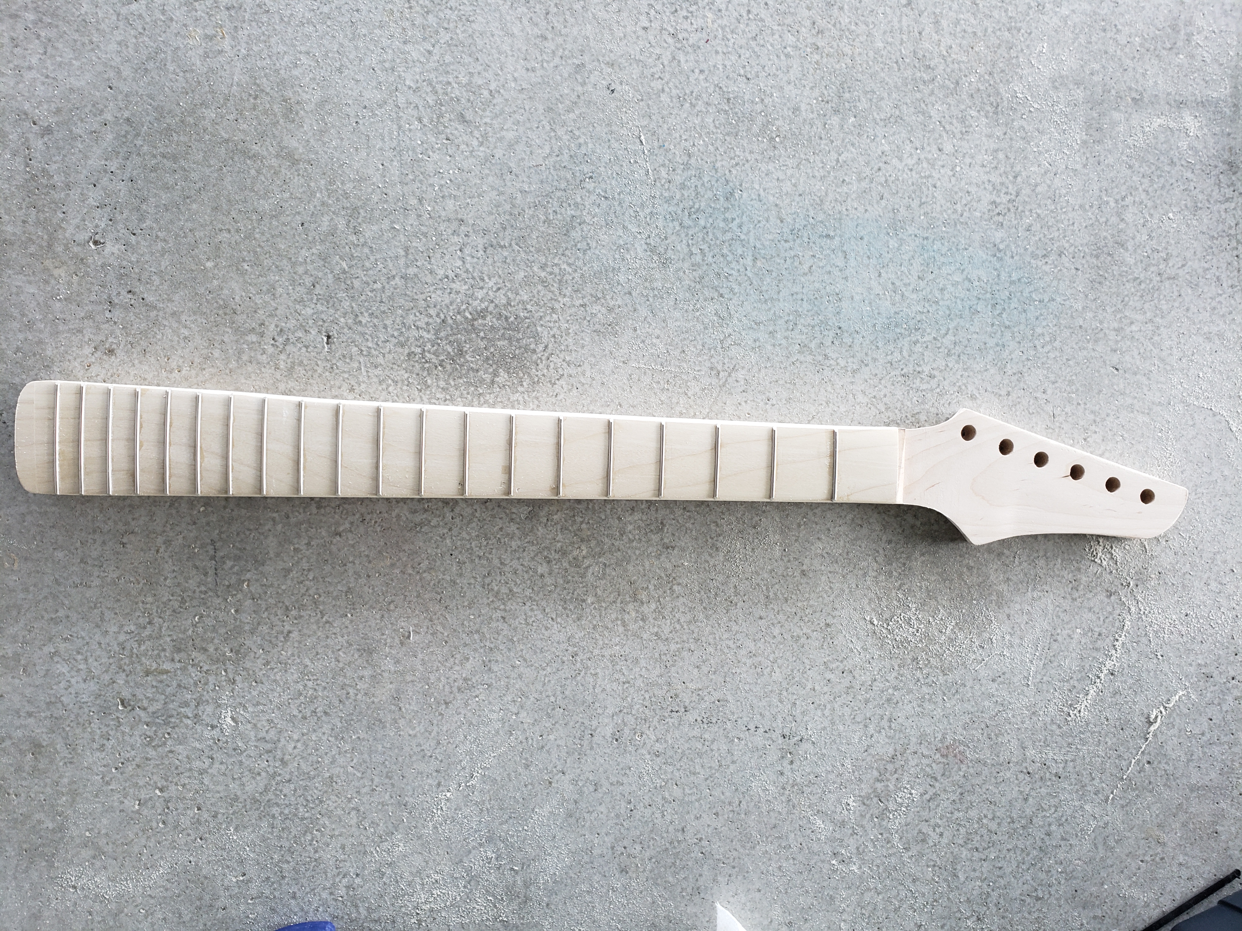 My process for inserting the frets was pretty simple; I would lay the fret wire on the slot and cut it, leaving a little overhang on both ends. I would then remove the wire, add some superglue to the slot, position the wire by hand, then use the clamp the press it into final position. I then had to repeat the process 20 more times. It was tedious, but it wasn’t awful. I then trimmed the ends of the wire and ran both sides of the neck across a belt sander to quickly remove any burrs. I still have to level and polish the frets and finish sand the rest of the neck, but for all practical purposes, the neck is ready to play, minus the nut. For this neck I’m using a bone nut and will install it last, when I’m ready to do the final guitar setup.